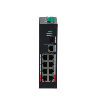 El switch dahua modelo PFS3110-8ET-96 de gama industrial no administrable, diseñado para administrar el envío de energía PoE ( máximo 96W ), cuenta con 8 puertos Fast Ethernet PoE + 1 puerto uplink Gigabit Ethernet + 1 puerto 1000 BaseX SFP , además la protección y el amplio rango de temperatura de trabajo lo convierten en un equipo con mejor rendimiento para trabajo en exteriores y/o ambientes hostiles.