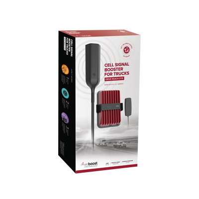 Drive Reach OTR es nuestro amplificador de señal celular multiusuario más potente para Tractocamiones. Está diseñado para alcanzar torres de telefonía celular a distancias de hasta un 74% más que el weBoost Drive 4G-X OTR.