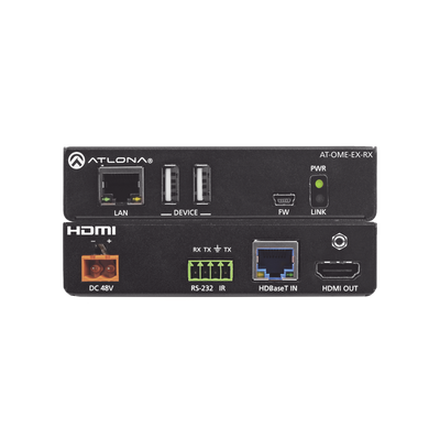 El Atlona AT-OME-EX-RX es un receptor HDBaseT para video de hasta 4K/60 4:2:0, además de audio integrado, control, Ethernet y USB a distancias de hasta 330 pies (100 metros). Como parte de la serie Omega™ de productos de integración para comunicaciones y colaboración AV modernas, el OME-EX-RX es compatible con HDCP 2.2 y recibe señales de control IR, RS-232 e IP. Con un transmisor HDBaseT a juego, la extensión USB integrada aborda el desafío de conectar dispositivos USB en ubicaciones remotas y es ideal para videoconferencias de software y pantallas táctiles o interactivas. El OME-EX-RX incluye dos interfaces USB para dispositivos como una cámara, barra de sonido o pantalla. Este receptor es ideal para usar con transmisores de la serie Omega, así como conmutadores con salidas HDBaseT. También está disponible el OME-EX-KIT que incluye OME-EX-TX y OME-EX-RX.