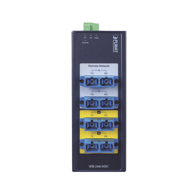 La serie IFB-244 aplica tecnología de fibra a fibra para lograr pérdidas ultrabajas y un tiempo de conmutación ultrarrápido. Dos de los puertos de fibra se utilizan para conectarse a dos conmutadores de fibra remotos y los otros dos puertos de fibra se utilizan para conectarse al conmutador de fibra local . La serie IFB-244 y el conmutador Ethernet de fibra local se alimentan de la misma fuente de alimentación. Cuando el sistema está encendido, la serie IFB-244 funciona en modo normal y reenvía paquetes Ethernet entre dos conmutadores de fibra remotos y el conmutador de fibra local. Cuando ocurre una falla de energía del sistema, la serie IFB-244 opera en el modo Bypass que reenvía directamente el paquete Ethernet entre dos conmutadores de fibra remotos y omite el conmutador de fibra local. Una vez que se recupera la energía del sistema, el tráfico de la red reanuda la operación entre dos conmutadores de fibra remotos y un conmutador de fibra local.