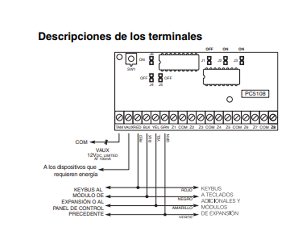 DSC Tarjeta de Expansion PC5108 – Añade 8 zonas cableadas de propósito general de robo o incendio. Proporciona 100 mA a 12 VCC de corriente auxiliar, PTC protegida. Conectar hasta 1000′(305 m) desde el panel de control a través del módulo KEYBUS.