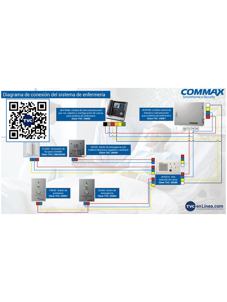 El sistema de llamado de enfermera de Commax (nurse call system) ofrece la línea de completa de equipos desde la unidad de cabecera de cama, pulsadores para cama y baño, alarma luminosa, consola de central de enfermería, así como la línea de intercomunicadores para unidades de radioterapia y resonancia magnética.