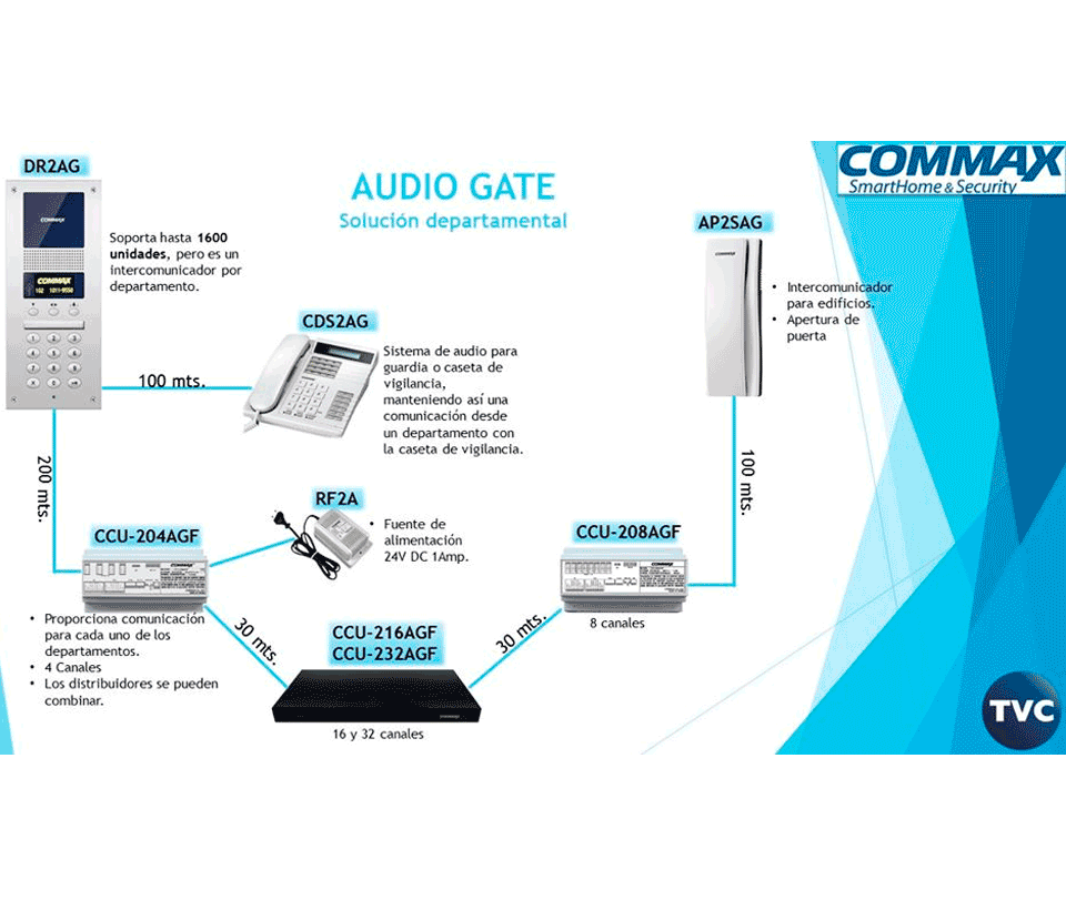El sistema Commax de Audio Gate es Optimizado por Multi-Complex Departamentos y Edificios. También provee un método simple de instalación expandida por una implementación de costo-efectivo. Provee varios métodos de autentificación como función de búsqueda de nombre y contraseña que proporciona la mayor conveniencia y seguridad.